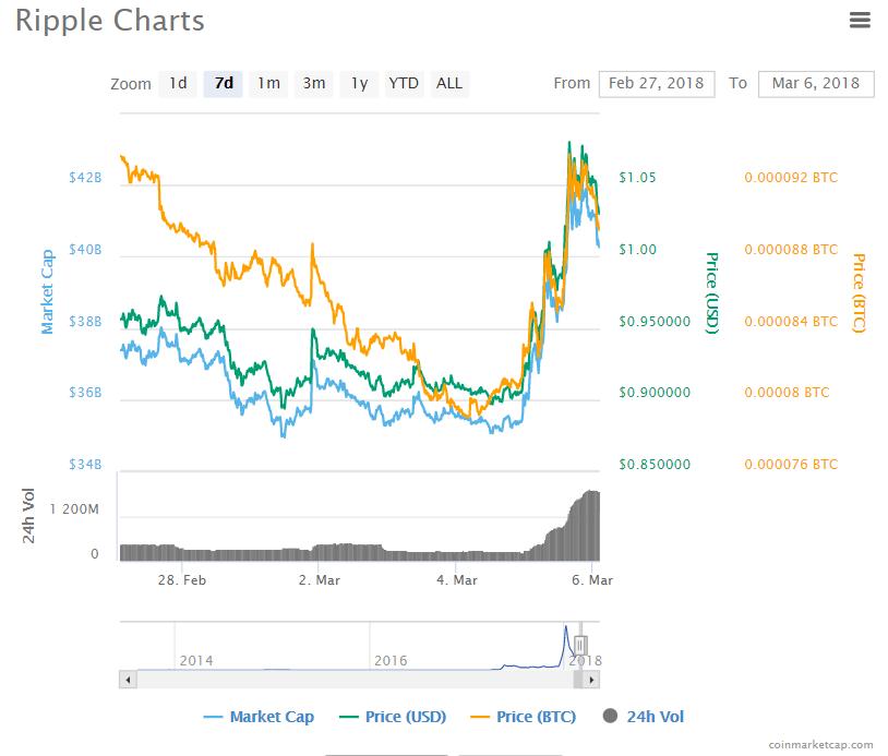 据追踪多家平台数字货币价格和市值的Coinmaketcap数据,北京时间3月5日瑞波币(XRP)交易价一度涨至1.08美元,较一天前水平高出将近20%。截至发文,瑞波币回落到1.03美元,日内涨近9%。