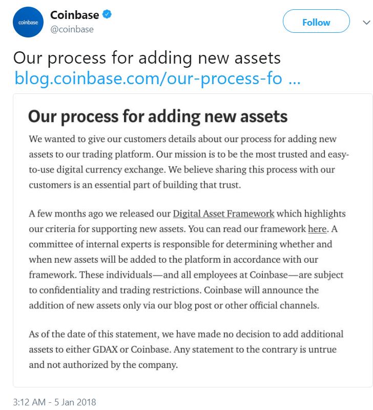 Coinbase方面并未对上述猜测予以回应,此后官方Twitter转发了今年1月发布的新增资产交易政策相关博客文章。当时文章提到,Coinbase并未决定增加新的交易资产,任何与此相反的陈述都是不真实的,未经公司授权。