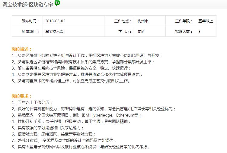 从岗位描述看,区块链专家将负责区块链业务的系统分析与设计工作,承担区块链系统核心功能代码设计与开发,并且参与拟定区块链框架和集团现有技术体系的集成方案,承担部分集成开发工作等。从岗位要求上看,淘宝想要从一些知名企业“挖角”有一定经验的技术人才,如“IBM”。