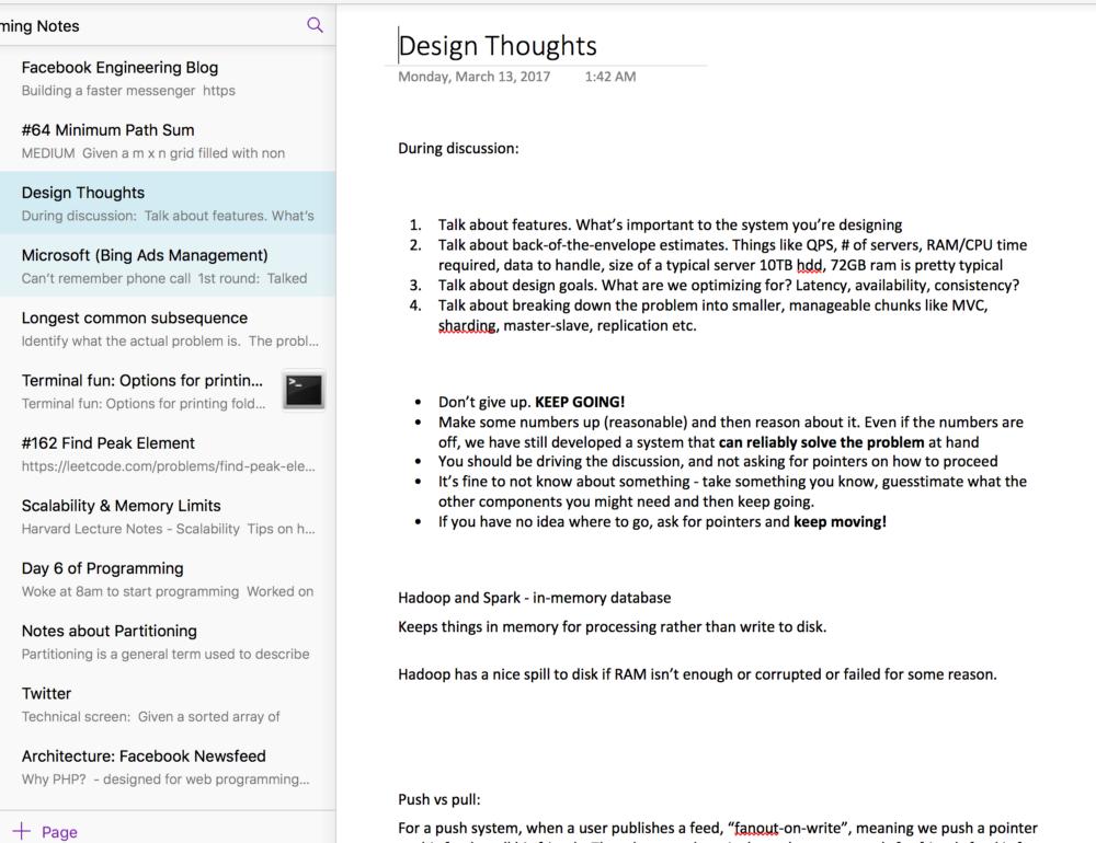 (3)将你掌握和学会的知识记在本子上。我同时使用Evernote和OneNote来记录和追踪事情。我用OneNote来记录技术方面的内容或代码,因为我可以按照我喜欢的方式来对这些笔记进行格式化。我用Evernote主要写一些文章或感想。上面的图片显示的是我在架构和系统设计上的一些想法。