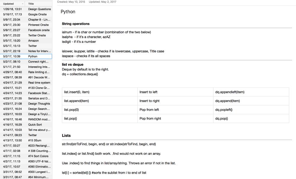 (2)建立一套用来练习技术技能的系统。我会根据1-10分的评分方式对自己的表现进行评分,并努力提升我自己最不擅长的领域。我花了好几天时间研究不同类型的面试问题,直到我完全掌握了每个概念。我每天都在Evernote上做笔记,笔记内容包括编程技巧、常见错误和误解、用于解决特定问题的框架等等。