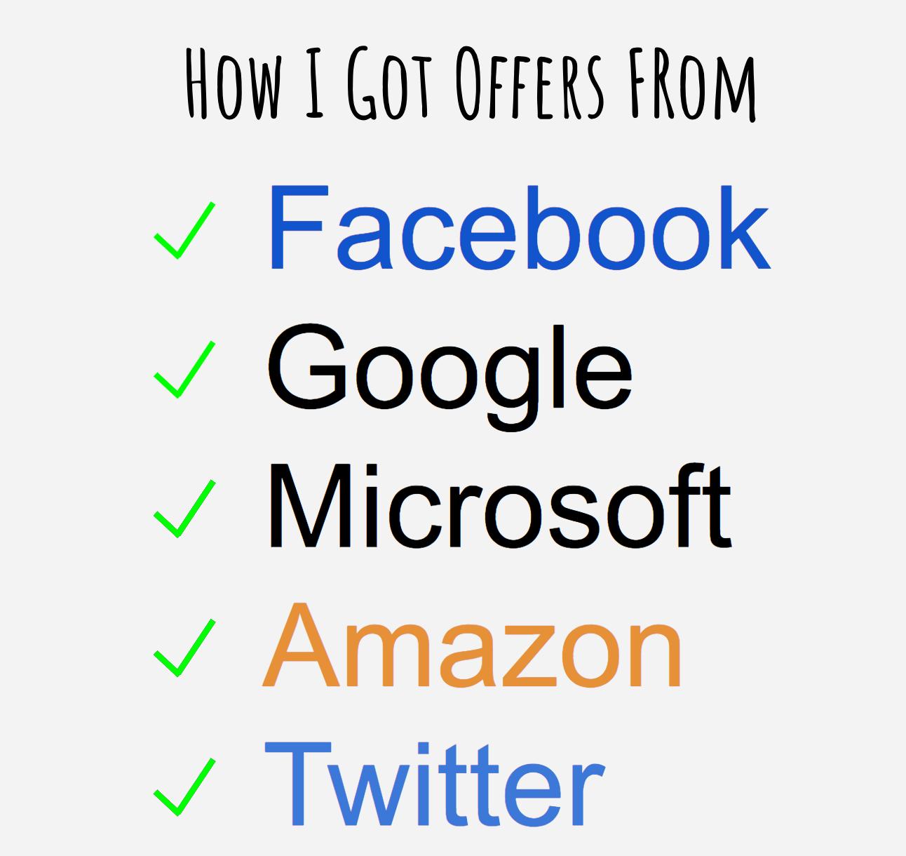 (2)我是如何获得众多全球顶尖科技公司的面试机会的,这些公司包括Facebook、Amazon、LinkedIn、微软、Twitter、Pinterest、Snapchat和其他公司。