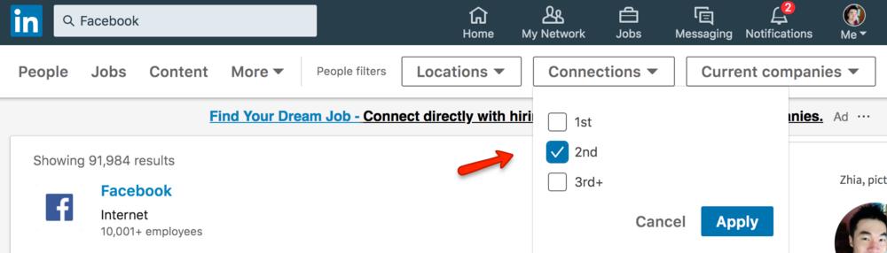 我并不善于交际,我认识的能将引荐给我感兴趣的公司的人其实并不多。为了解决这个问题,我会经常使用LinkedIn。LinkedIn里有一个搜索功能,我经常用它来搜索1 度联系人和2度联系人。所谓1度联系人,就是通过接受邀请直接建立联系的会员。你可以查看他们的个人档案和人脉信息,不受限制地向对方发送站内信,还可以在你的个人首页看到对方在领英的动态消息。所谓2度联系人,就是已经与你的1 度联系人建立联系的会员。通俗理解就是你好友的好友,一般是没有建立直接联系,但和你可能有交点的人群。免费账户可以看到2度人脉的个人档案,可以看到和对方的共同联系人,但不可以直接发站内信。