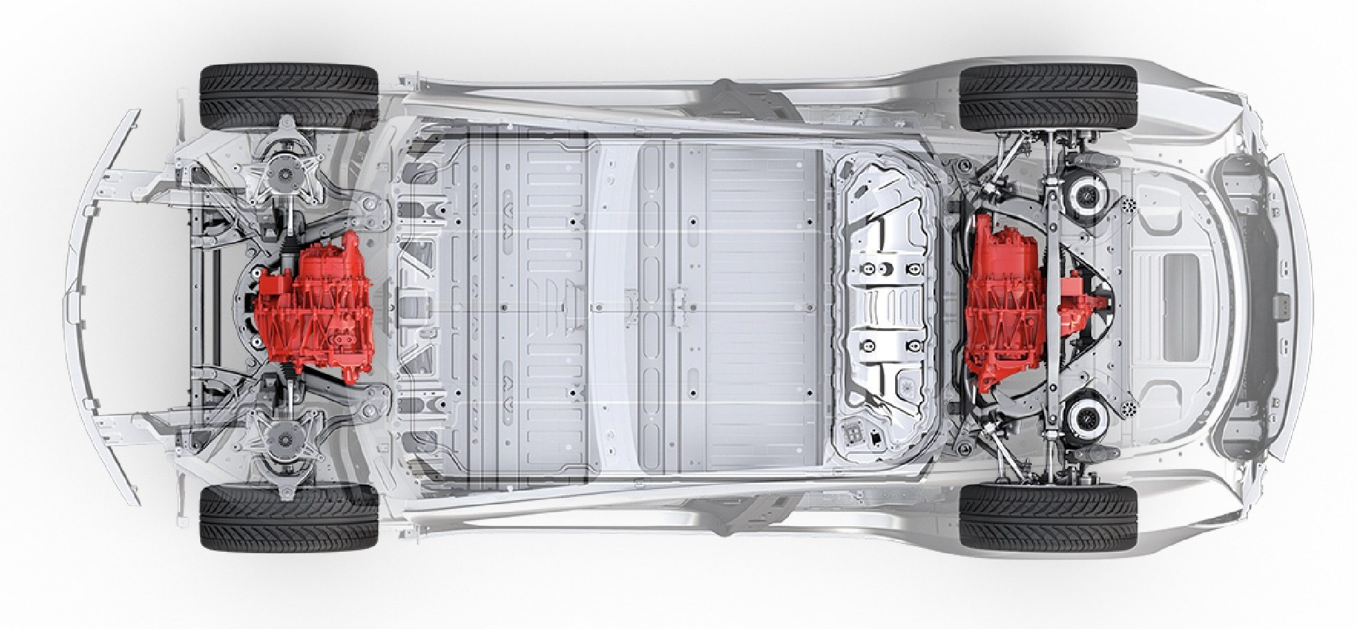电动汽车时代,各家车厂动力总成的布置开始趋于一致:电池组平铺于车身底部以降低重心同时提升车内利用空间;电机布置在前后轴的位置。