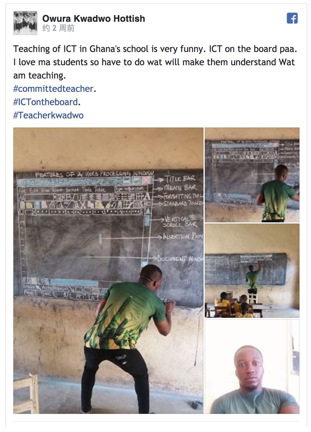 在非洲加纳,有这样一位老师,他为了教学生怎么使用 Microsoft Word,在黑板上把每个界面都画了出来,供学生在没有电脑的情况下通过笔记学用 Word。在加纳,因为电脑和电的条件不够,老师们不得不采取这样的方式教授学生。而该教师在Facebook上分享自己在教育学生上的心得时,也丝毫不谦虚地为自己加了一个#committedteacher(#尽职尽业的教师)的标签,可以说是自己给自己“加冕”了。