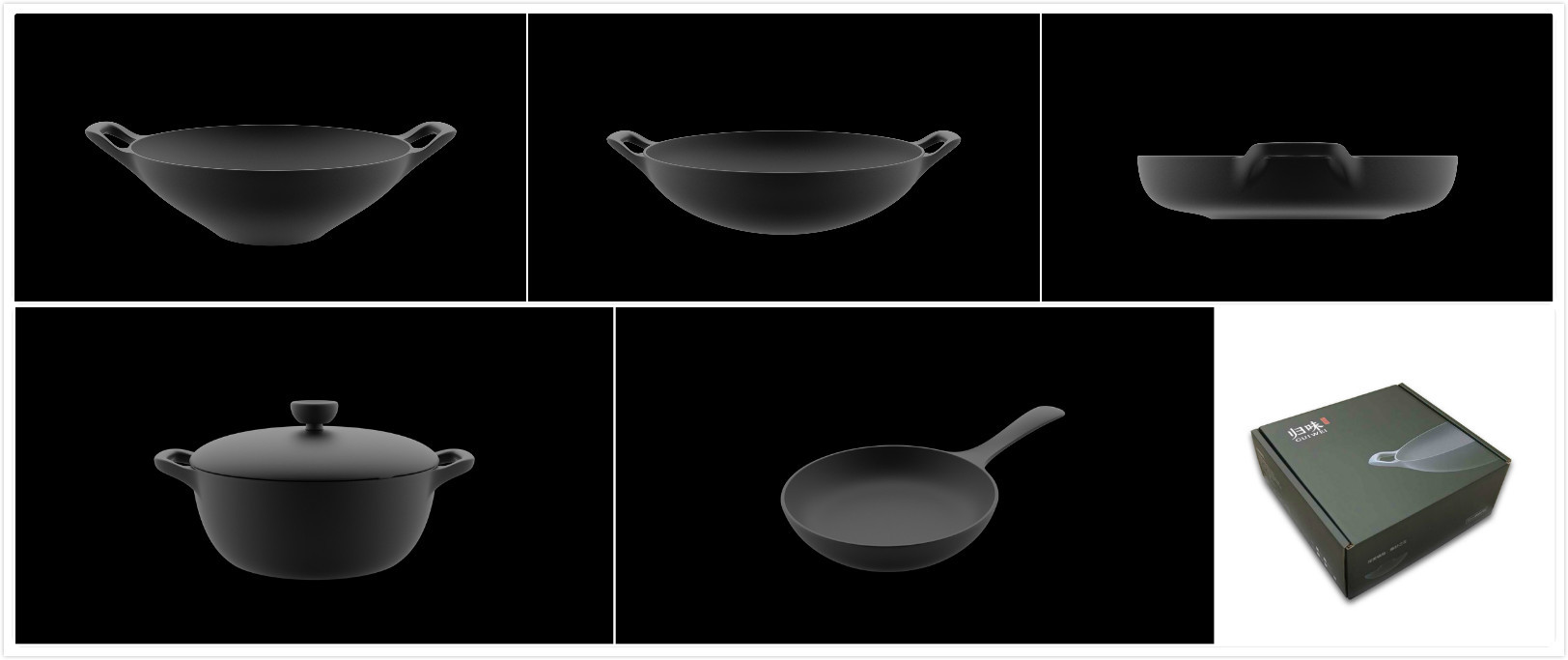 第一排到第二排,从左到右分别为黑牛一体锅、银河炒锅、盘古煎锅、福宝炖锅、猫耳煎锅以及产品包装