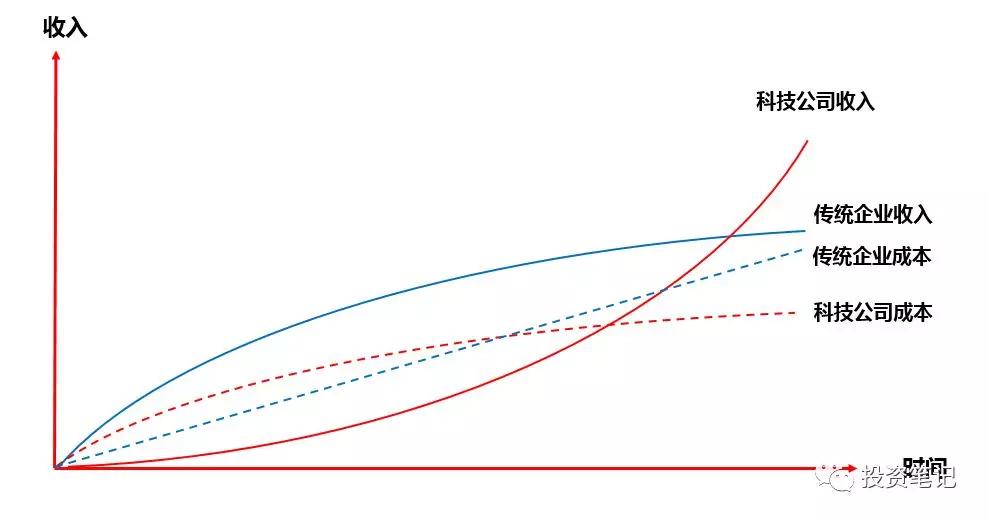 大多数传统企业研发投入成本低,经营规模随时间发展,其成本一般呈线性递增,而其收入呈边际递减,于是其盈利能力随着规模增长总有一个时间点便会很快到达效能上限,比如A股大部分传统行业公司,在上市之后业务很难再继续保持高速成长。