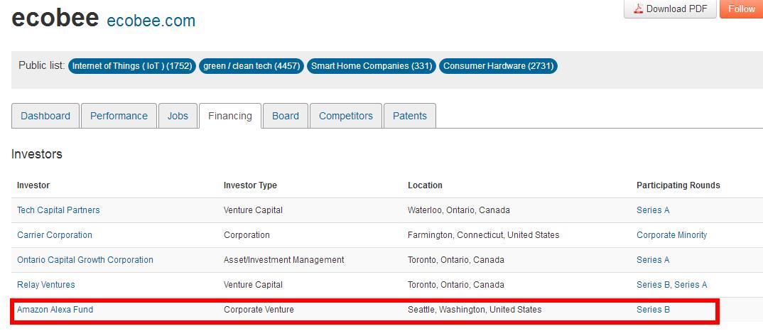 36氪作者通过查询CB Insights数据发现,早在2016年8月18日,亚马逊“Alexa 基金”、Thomvest及Relay两家风投公司就曾对Ecobee进行过3500万美元的B轮投资。