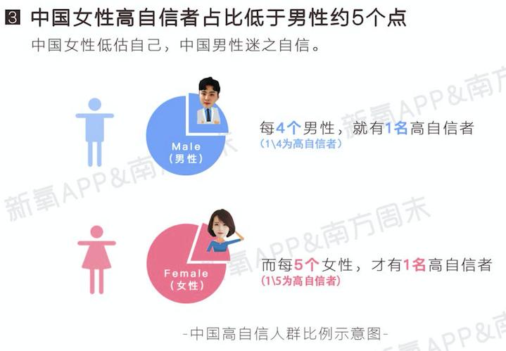 调查显示,中国男性的高自信者占比为25%,中国女性的高自信者占比为20%。