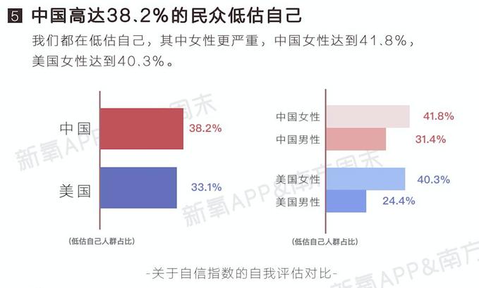 调查显示,中国高达38.2%的民众低估自己,且女性低自信指数远低于男性,差异明显。