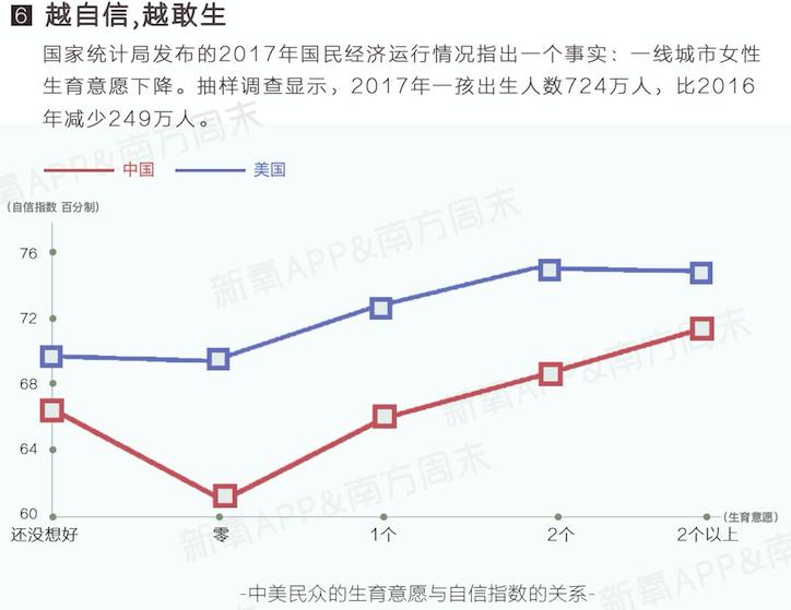 自信指数越高的民众,生育意愿越强。相反,一线城市女性自信指数不高,生育意愿下降。
