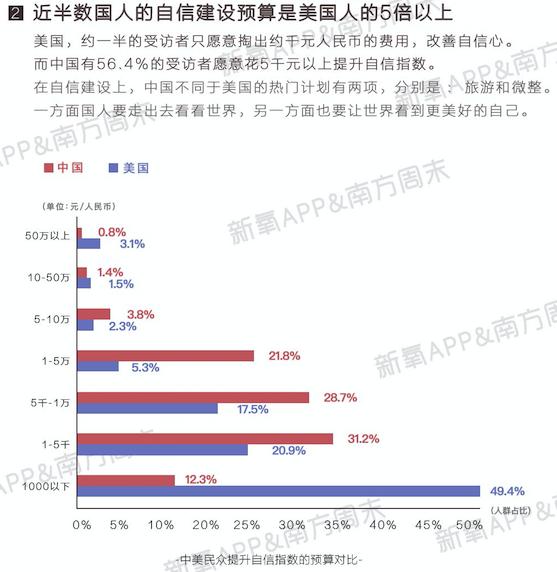 据本次调查显示,近一半的美国民众不愿意花钱改善自信。而56.4%的中国民众愿意花5千元以上提升自信指数。