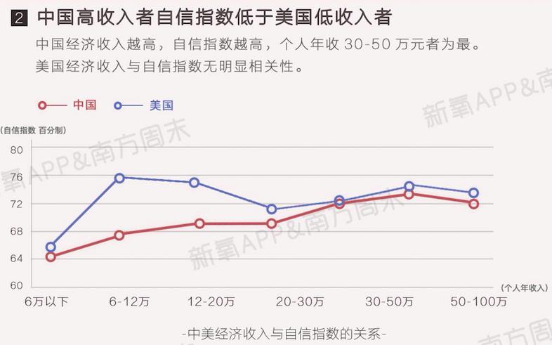 在中国,经济收入与自信指数成正比,个人年收入30-50万元者为最。