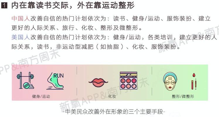 中美两国改善自信的热门计划中有大量重复项,排除重复后,我们看到,中国有、美国没有的计划是:旅行、整形及微整形。