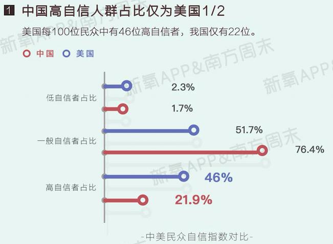 调查显示,美国每100位民众中有46位高自信者,而中国仅有22位。高自信者是指那些可以从经历中汲取经验,不会让挫折影响自己的人群。