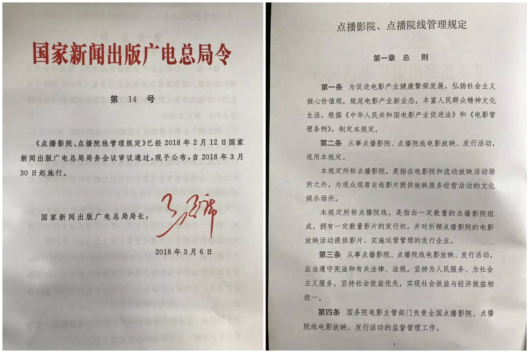 36氪获悉,日前,国家新闻出版广电总局第14号文件《点播影院、点播院线管理规定》(以下简称“《管理规定》”)已正式审议通过,并将于2018年3月30日起正式实施。