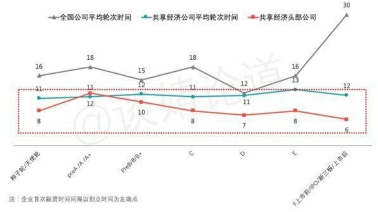 图3:国内共享经济公司各轮次间间隔与平均值对比