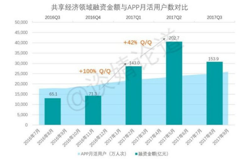 上图截取了2016年第三季度到2017年第三季度,共15个月的共享经济APP月活用户数和行业内累计融资金额,对比出融资金额增长远快于运营数据增长。较之于APP月活用户数不足10%的季度环比增长率,2017年第一季度到2017年第二季度的融资环比增长率达到了100%和42%之高。两组数据巨大落差的背后,是资本对风口的趋之若鹜,而背离了价值投资。