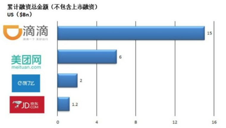 互联网的垄断属性,导致资本越来越迅速的向头部行业集中,资本成为共享经济企业核心竞争力之一。自此产品和业务能力并不是唯一的成功要素。将业务优势转化为资本优势,迅速聚集资本,再将资本转化为业务优势,成为共享经济企业的成功之道。截止目前,滴滴累积融资额已达150亿美金,美团融资60亿美金,饿了么和京东也已分别获得20亿和12亿美金的融资。这些头部企业的融资规模正急剧放大,资本对公司发展的推动作用也在加强。