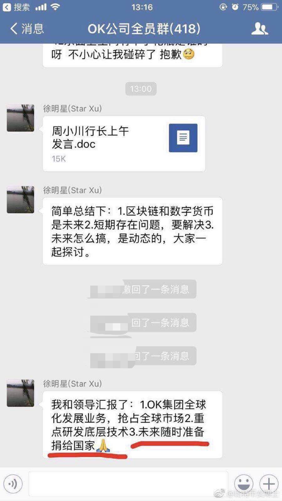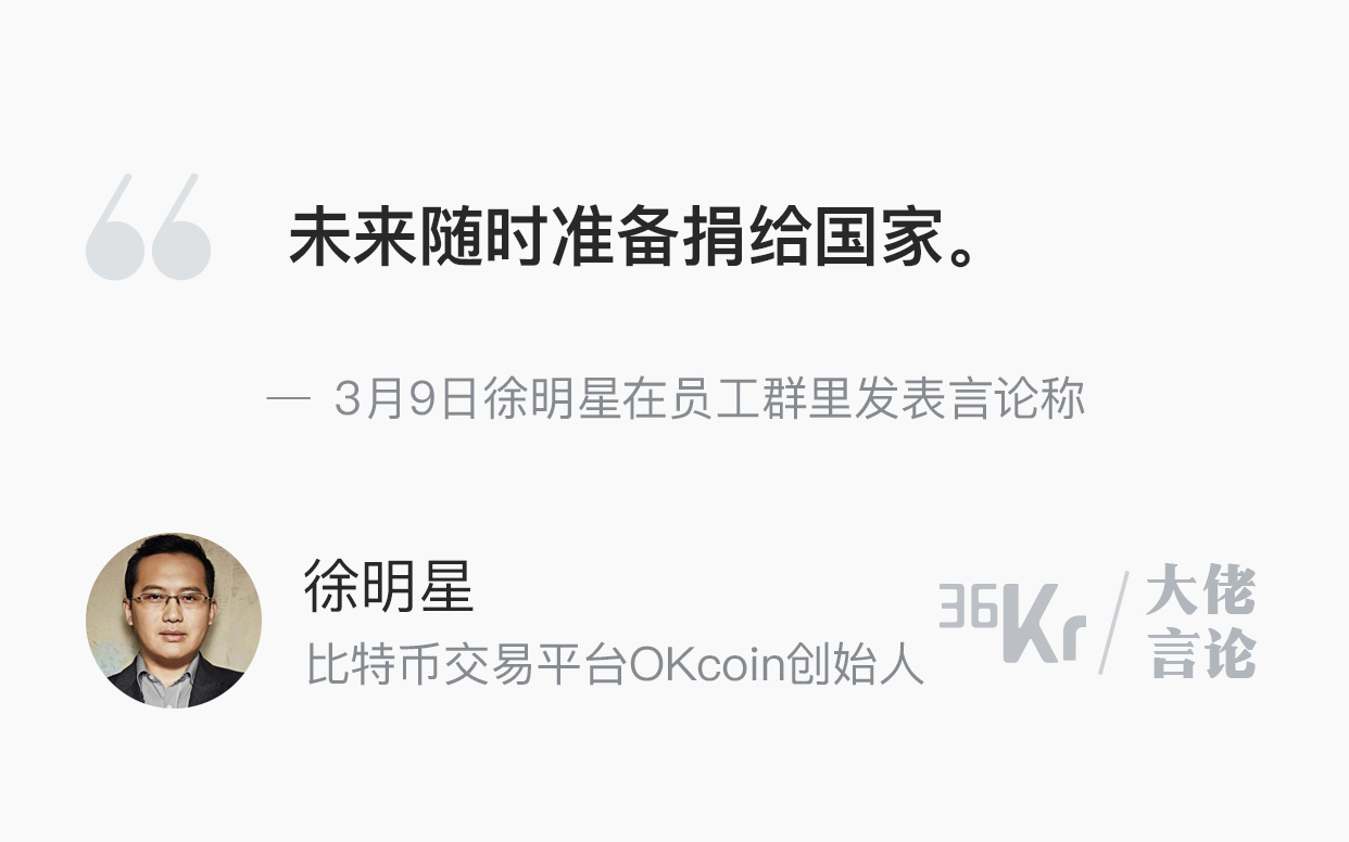 据创业家消息,国内比特币交易平台OKcoin创始人徐明星今日在员工群里发表言论称,“未来随时准备捐给国家。”此外,徐明星还称已向领导做了汇报,“1、OKcoin集团全球化发展业务;2、重点研发底层技术;”