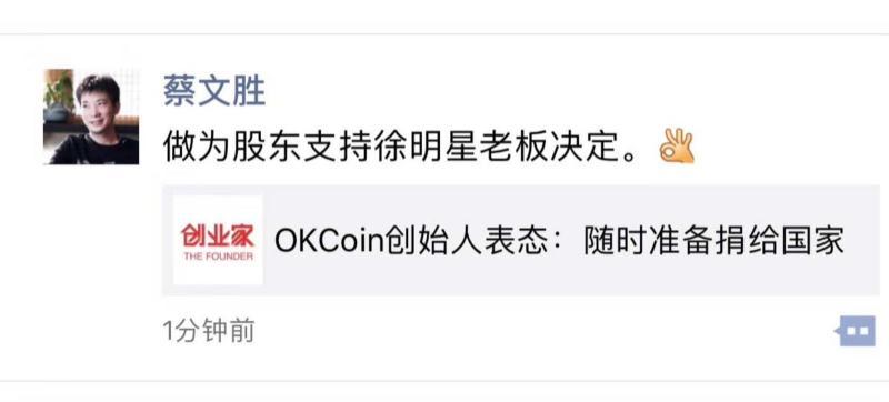随后,OKCoin股东蔡文胜表态支持徐明星决定