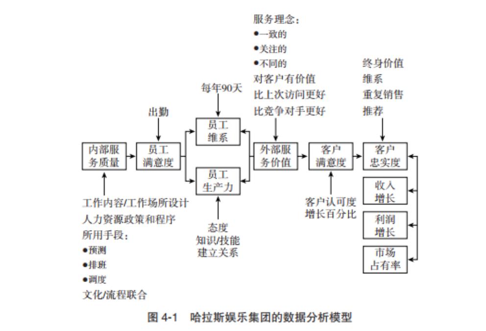 有很多种方法供你对企业、企业的绩效驱动因素以及它的差异化机遇进行全局思考,不过,最重要的一点是运用企业熟悉并且应用得好的方法。大部分方法将你的“核心流程”以某种方式进行分解,进而探寻各种活动在业务中起到什么作用。例如,哈拉斯娱乐集团的管理者通过客户忠诚度计划以及数据驱动的营销手段驱动公司成长,这些是公司的特色能力。他们用了“服务利润链”( service-profit chain)模型来对关键决策领域进行理解并确定目标每项活动都采用了明确的度量指标(如图 4-1)。