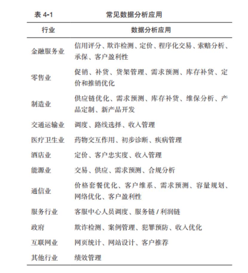 很多企业也开始通过调查其所在行业的其他公司在做什么,来寻找新想法和新方法。商业趋势和行业趋势意味着什么样的变革需求和机会?表 4-1 列出了一些最常见的数据分析应用。定期关注你所在的行业,并详细观察你的竞争者的活动,这样可让你保持警惕并时刻告诉你必须做什么以跟上竞争对手的脚步,以及变化中的客户预期的脚步。