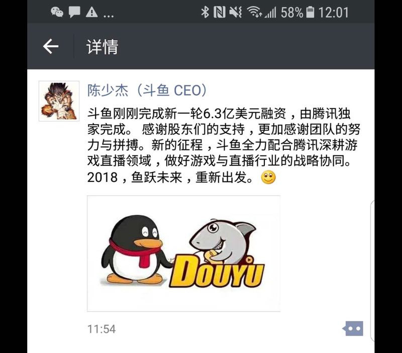 3月8日,斗鱼CEO陈少杰发朋友圈称斗鱼刚完成6.3亿美元融资,腾讯独家。同日,欢聚时代公告称,旗下虎牙直播获得约4.616亿美元B轮战略投资,投资方为腾讯,后者或将在未来两至三年以公平价值收购不超过50.1%投票权的虎牙股份。同时公告显示,腾讯后续还有机会进一步投资虎牙。