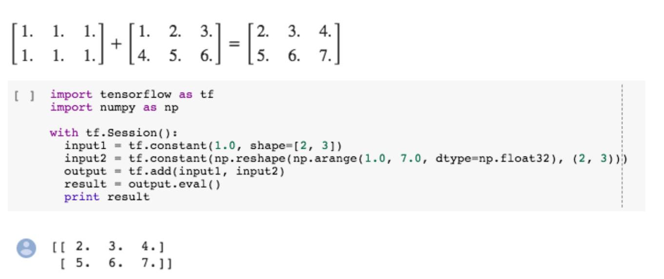借助 Colaboratory,您只需点击一下鼠标,即可在浏览器中执行 TensorFlow 代码。下面的示例展示了两个矩阵相加的情况。