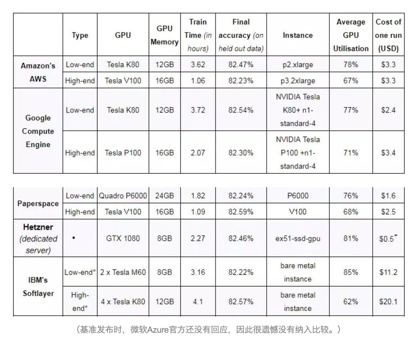 初创公司Rare Technologies最近发布了一个超大规模机器学习基准,聚焦GPU,从配置到训练时间、精度、价格等各方面对比了AWS、谷歌云、IBM等6家GPU硬件平台,这几家在机器学习成本、易用性、稳定性、可扩展性和性能等方面的性能如下: