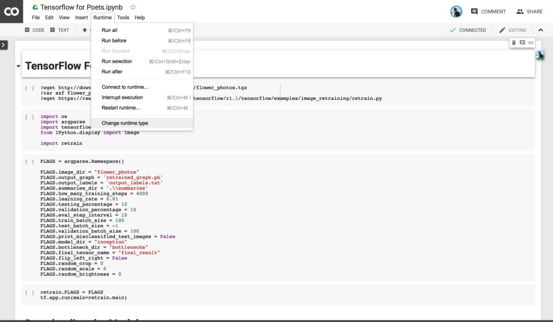 选择 Runtime > Change runtime type:
