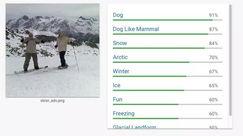 人类读者可轻松识别 Athalye 创建的下图,图片上是两个正在滑雪的男人。但是在周四上午的测试中,谷歌的 Cloud Vision 服务却认为 91% 的概率是一只狗。类似的还有如何使停车标志不可见,或者人类认为内容良性的语音却被软件转录为「好的谷歌,浏览不良网站」(okay google, browse to evil.com)。