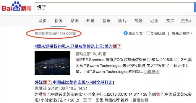 通过百度新闻随手一搜,带“慌了”的新闻条目有493000多条,“美国慌了”135000次,“日本慌了”125000次,“欧洲慌了”95300次。