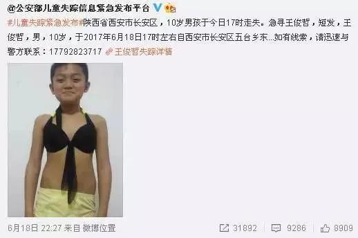 去年6月中旬,一个名叫“王俊哲”的男孩走失,父母及时报警,消息通过公安部的信息发布平台对外推送。唯一的问题是,父母提供的孩子照片,是他穿着兔女郎式比基尼,站在墙头忍俊不禁的一张照片,虽然是人命关天的失踪信息,却看得人一点也严肃不起来。