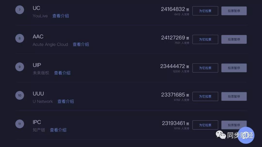 在75个项目选10个,这是一场绝对财力的比拼,投票开始AAC、SHE、UUU、YCC、IPC等五个项目就迅速领先。在2月25号时,IPC甚至还在多个媒体上发布通告宣告第一,看似势在必得,但26日风云变换,一批项目纷纷压重注参与,UUU、YCC、IPC排名还是迅速下滑。