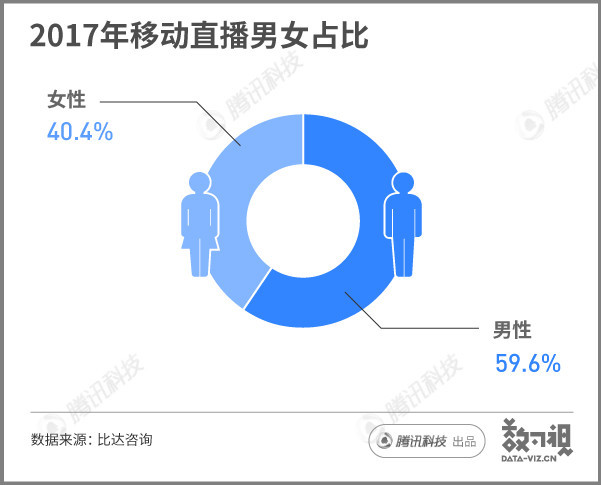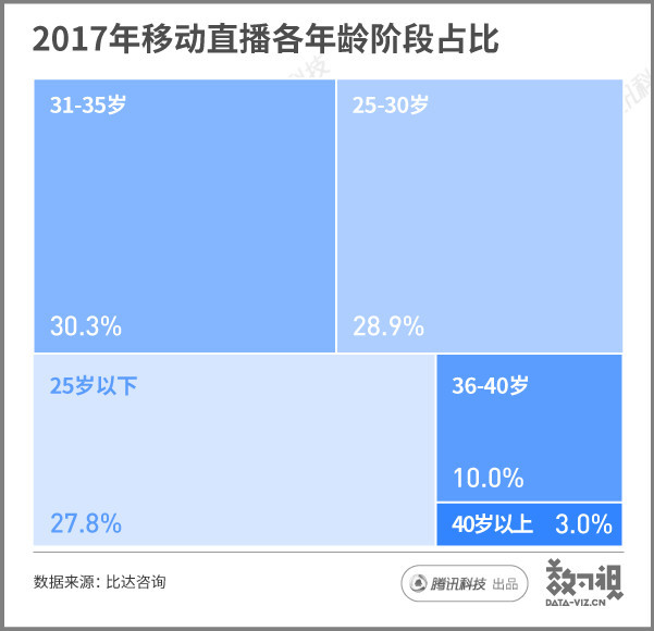 2017年移动直播用户男性占比接近6成;从年龄分布来看,年青人(35岁以下)为移动直播的主要用户,总占比高达87%。