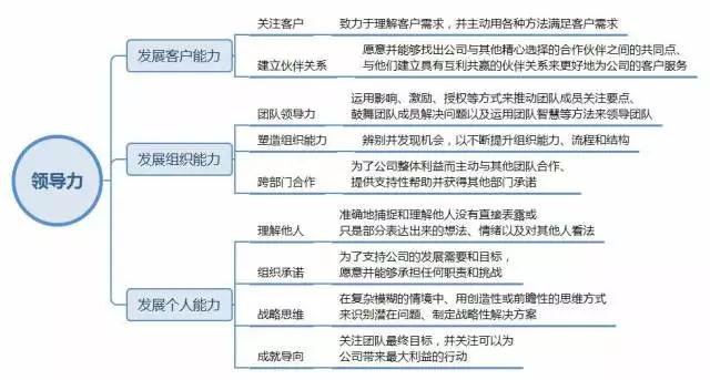 决断力:对于公司高级领导或者业务部门一把手,该能力尤其重要,需要在各方利益纠缠不清时勇于担当责任并指明战略方向,带领团队最终实现目标;但决断不代表武断,决断力是一种对于直觉的把握能力和缜密思考的判断能力的综合体;