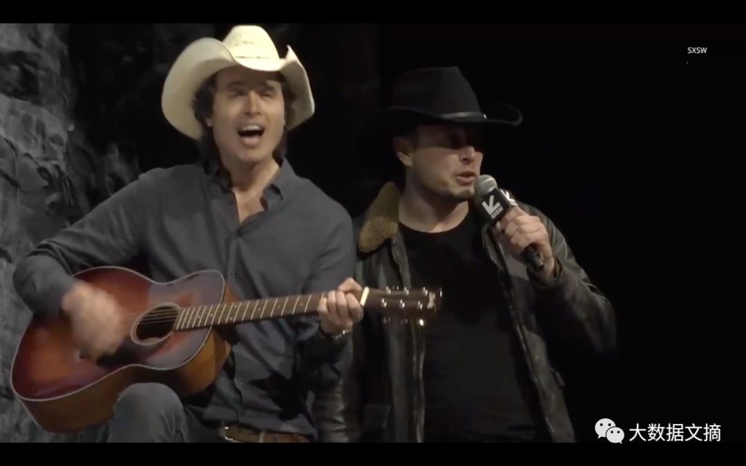 这场对话持续了约一个小时。最后,马斯克的弟弟Kimbal Musk拿着吉他、头戴牛仔帽登台,诺兰和马斯克也都戴上了牛仔帽,三人开始合唱西部片《神勇三蛟龙》中的插曲My Little Buttercup,还号召全场观众一起来。