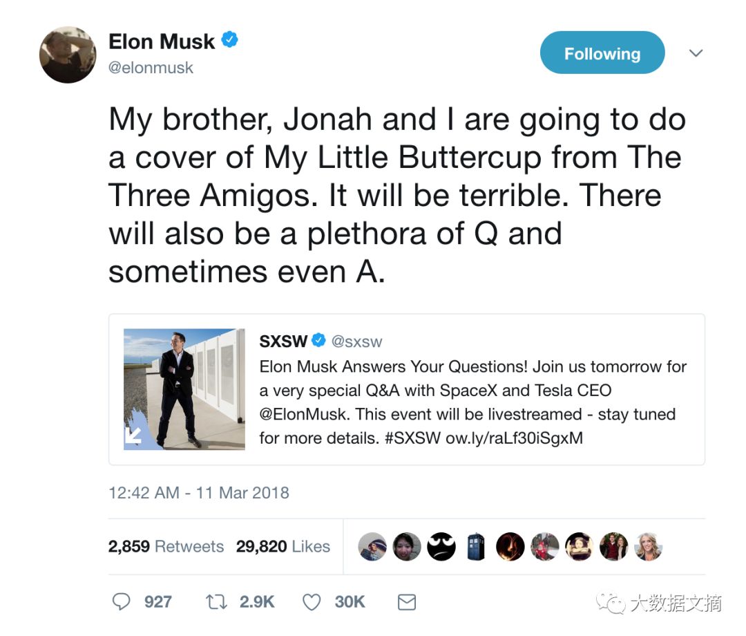 Elon Musk昨晚给了SXSW 2018(西南偏南艺术节)的听众们带来了一个大惊喜:现身在奥斯汀市的穆迪剧院,并与西部世界导演乔纳森·诺兰对聊了一小时。