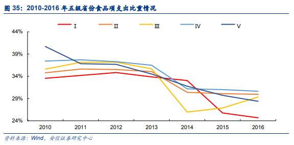 分项来看,食品类消费中,除了部分中等收入省份外,多数地区食品消费支出逐年下降。