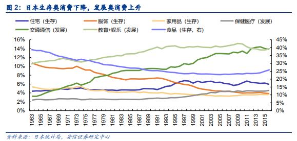 借鉴日本经验,当基本生存发展需要得到满足后,人们会去进一步丰富自己的物质和精神生活,发展类消费逐渐成为消费重点,主要包括医疗保健、教育娱乐和交通通信等方面。