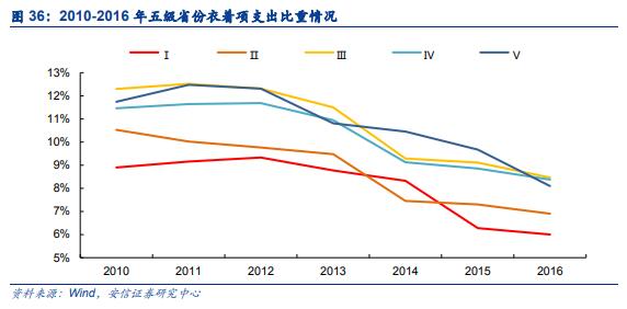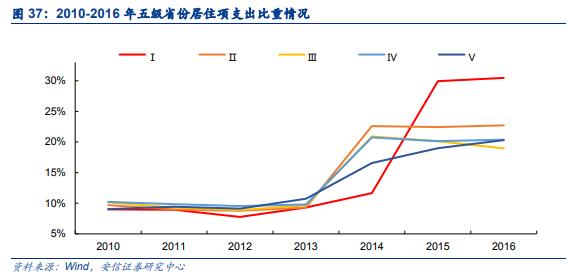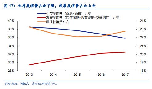 安信证券认为,中国特有的巨大地区差异造成消费升级的结构分化:经济发展水平较高的地区,生存类消费下降明显,居住类占比提升显著,居住类甚至挤压发展类消费,加上人们消费观念的变化,有消费“降级”的迹象。中等水平省份居住项占比不高,发展类消费出现强劲的升级趋势。排名靠后的省份中生存类消费占比仍较高,但发展类已经出现提升迹象,有巨大的升级潜力。