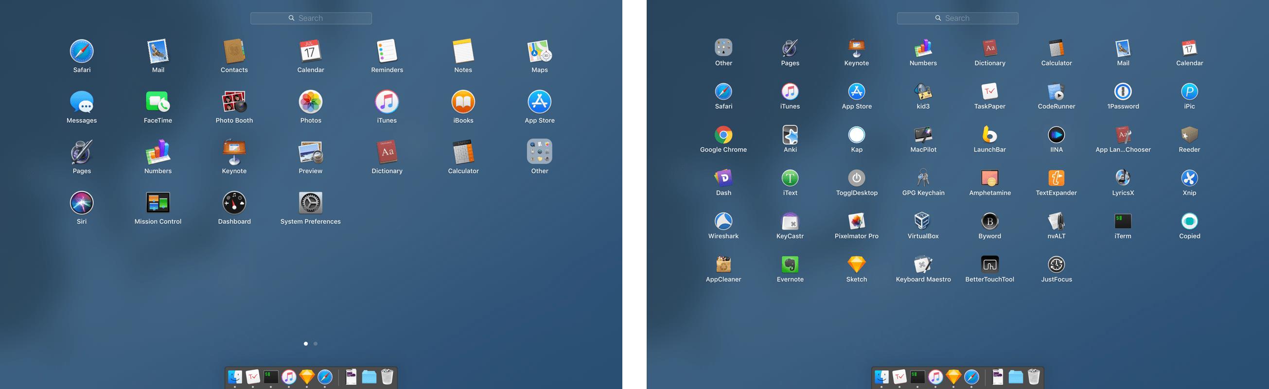 defaults write com.apple.dock springboard-columns -int 8; defaults write com.apple.dock springboard-rows -int 7; defaults write com.apple.dock ResetLaunchPad -bool TRUE; killall Dock命令使用前后对比
