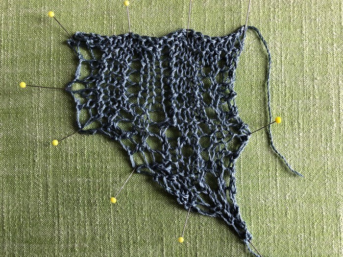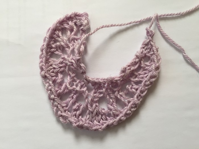 “‘面包烤鱼’图案的织法操作里面,不是每行的针步都能用的。所以我会重复某些针步再收针。第二、四、五、七行针数不够,我都是凭感觉把图案织完的。如果图案正面是连续空针的话,织背面时要先下一针,再反针,而不是只下针或反针。所以第二行和第六行遇到连续空针的时候,我就这么做。”