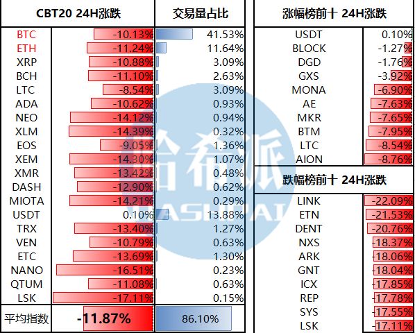 昨日数字货币市场整体下跌,大盘全线飘红,目前市值下跌至3319.19亿美元。CBT20平均跌幅11.87%,其中只有USDT现涨幅,涨幅0.1.%,BTC跌幅10.13%,跌幅较大的有LSK(-17.11%)、NANO(-16.51%)、XLM(-14.39)、XEM(-14.30%)。市值前100币种只有USDT(+0.10%)现涨幅,其余币种大部分下跌逾10%,跌幅榜中,跌幅较大的有LINK(-22.09%)、ETN(-21.53%)、DENT(-20.76),平均跌幅接近19%,涨幅榜中,跌幅较小的有BLOCK(-1.27%)、DGD(-1.76%)、GXS(-3.92%),平均跌幅6%左右。