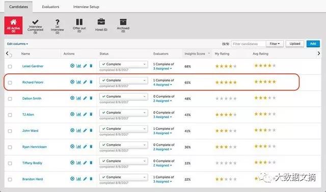 排名算法会让表现好的候选人脱颖而出,招聘者就可以着重了解这些候选人的答案,并确定谁可以进入下一轮,通常是面对面的面试。