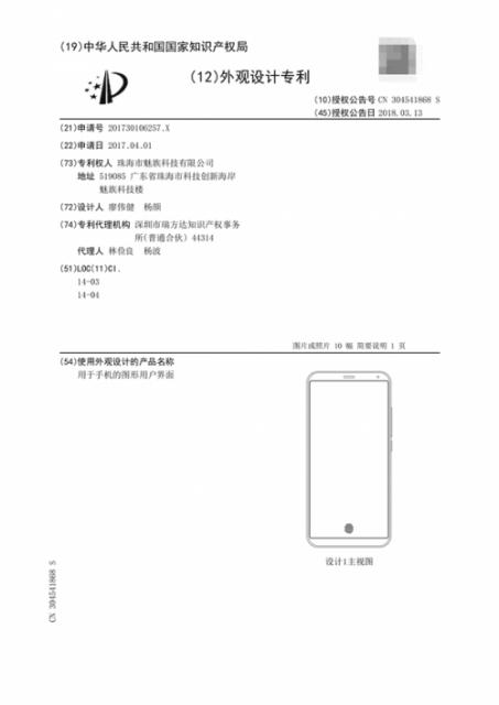 据TechWeb报道,最近魅族的一项外观专利曝光,展示了他们的屏下指纹设计。根据曝光的专利扫描文件看,魅族在3月13日获得了一项屏幕下指纹外观设计专利,这份专利是去年4月份申请的。图片当中显示,在一个全面屏智能手机上,屏幕下方有指纹识别模块,同时支持指纹支付的功能,意味着与独立指纹模块没什么使用上的区别。