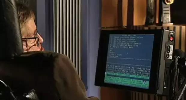 1987 年,霍金不幸患上了肺炎,不得不接受气管切开术,而这次手术意味着他所拥有的有限语言能力也随之被剥夺。更糟糕的是,当时的他其实已经十多年没有进行过写作,甚至是使用键盘。他剩下的唯一沟通方式是把目光对准放于面前的字母表上的一个个字母来传递其所思。