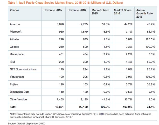 据最新的Gartner全球云计算市场数据,这一“巨无霸”趋势有增无减,亚马逊全球市场份额44.2%,微软7.1%,阿里云3%,这三家后面的厂商份额仅为1%或者2%。更加值得关注的是,市场第六位之后的厂商从2015年到2016年均出现了市场份额的萎缩。