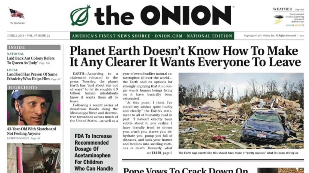 《洋葱报》是一家拥有报纸和网站的新闻机构,闻名于以用严肃笔调来杜撰报道的讽刺文学“洋葱新闻”。他们经常会将街边小事当作超大新闻来报道,又或者以超现实主义的夸张手法来看待一些现实问题。